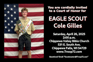 The highest award from the Boy Scouts of America -- the rank of Eagle Scout -- will be awarded Saturday, April 26, 2025, to a Scout in Troop 72 of Chippewa Falls, Wisconsin. Cole Gilles, 16, will receive the Eagle Award in a Court of Honor ceremony at 2:00 p.m. that Saturday at Chippewa Valley Bible Church, 531 E. South Ave, Chippewa Falls, Wisconsin. All are welcome. Cole is the son of Gary and Elizabeth Gilles of Chippewa Falls. He is in the Class of 2027 at "Chi-Hi" (Chippewa Falls Senior High School) where he is active in jazz band, cross country, swimming, track, math club, and chemistry club, earning three varsity letters as a freshmen, not an easy feat at a competitive Division 1 school.