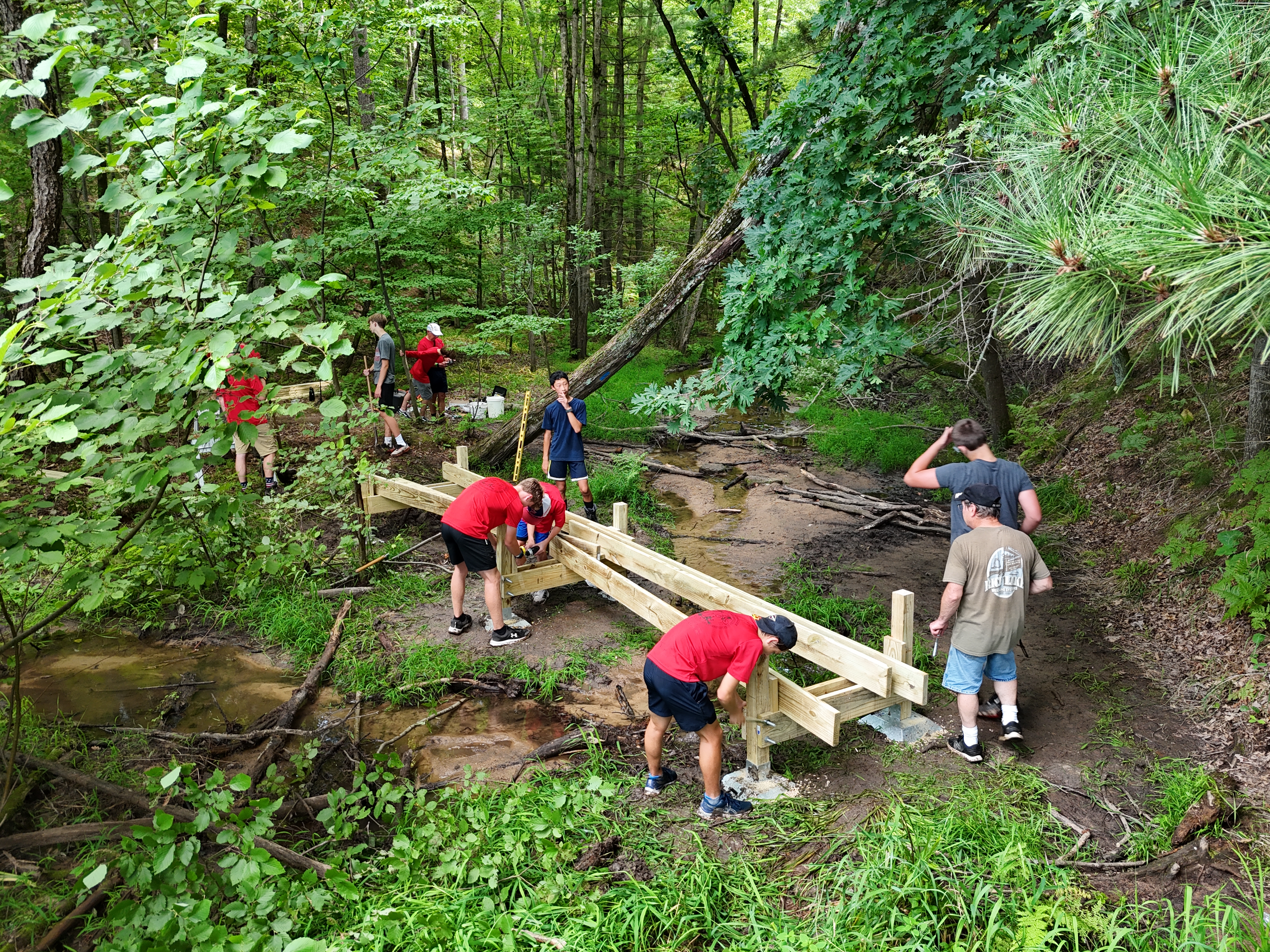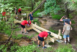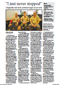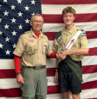 In Scouting, Cole has led the troop on several campouts during his term as Senior Patrol Leader, the highest position in the troop, and has also held the positions of Bugler, Patrol Leader, and Quartermaster while participating in many campouts during his five years with the troop so far. In addition to regular campouts, Cole was the main instigator behind the troop's self-contained bike trips, where everyone carries all his camping gear, clothing, and tools on his own bike. Cole has biked with the troop (and all his gear) on a 352-mile bike trip from Chippewa Falls to La Crosse and Madison in 2023, and a 438-mile trip from Chippewa Falls to Green Bay and Milwaukee in 2024, and plans to do another long trip in June 2025. Cole is a member of The Order of the Arrow (Scouting's "National Honor Society"). For his Eagle project, Cole led a team of Scouts in building a footbridge on the new Glen Loch Trail in Irvine Park, to allow hikers to cross a wet and muddy area below the Rumbly Bridge. Cole works hard outside school: He started his own lawn-care business and gets a workout mowing many lawns in the area. The public is invited to the Court of Honor Saturday to help celebrate this young man's accomplishments.